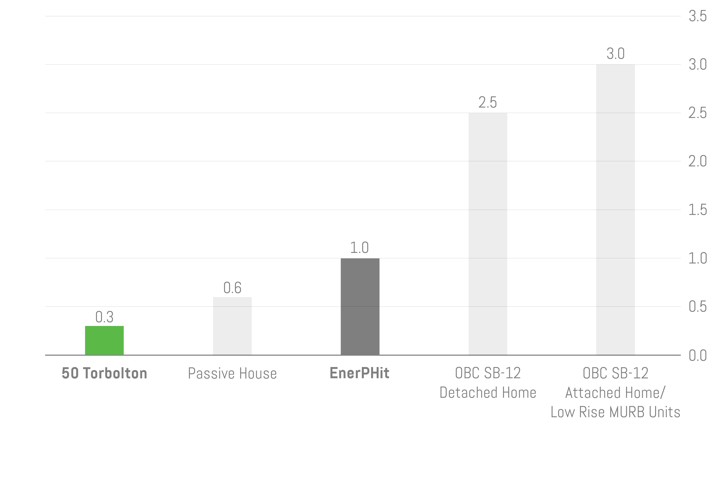 By comparison, 50 Torbolton’s test results are over eight times lower than OBC SB-12 Detached Home standards, and ten times lower than the standard for attached homes and low rise MURB units.