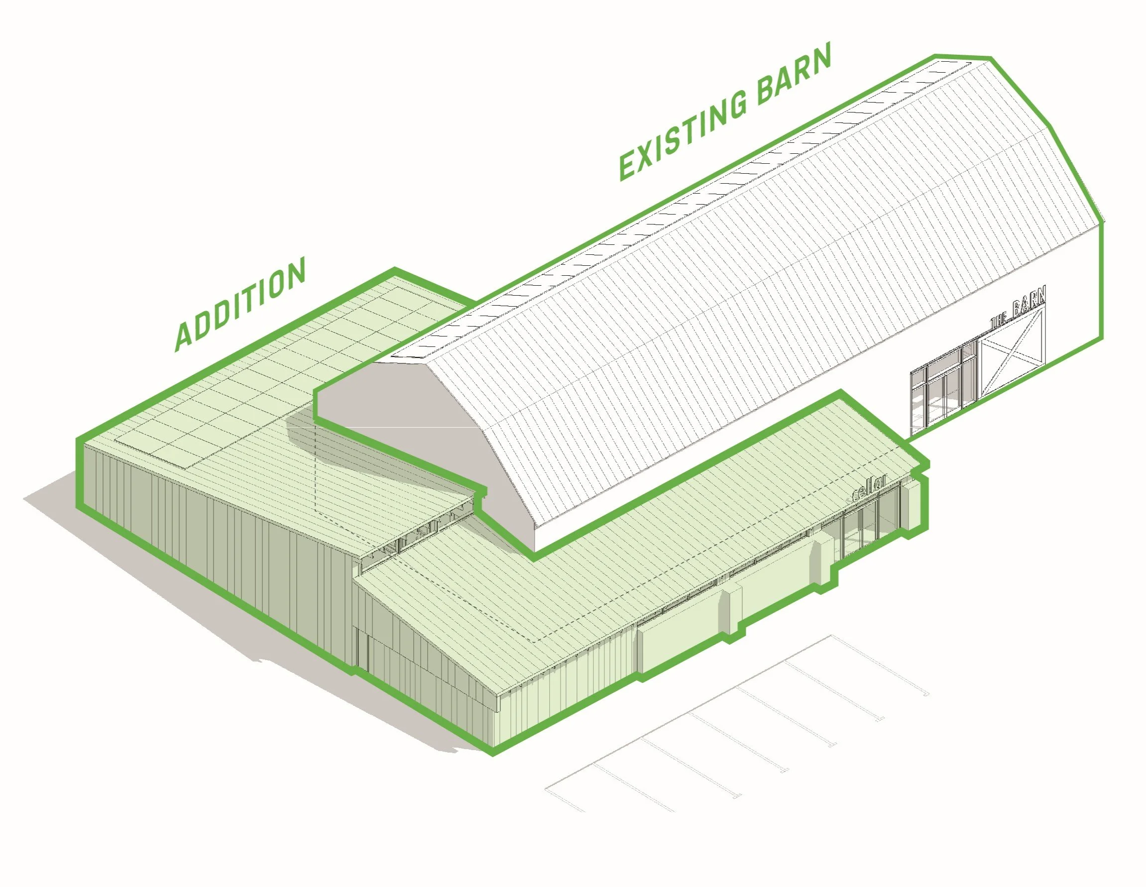 The addition was designed to utilize an existing stone wall located on the north side of the barn to create a retail bottle shop, taproom, and café, serving both indoor and outdoor events. The addition wraps around the rear of the barn to minimize visual impact from the front perspective of the original barn. Reclaimed barnboard and steel roofing are proposed on the exterior to blend the design of the addition with the original barn. The addition will also support new brewing space, walk-in refrigeration and washrooms for servicing events.